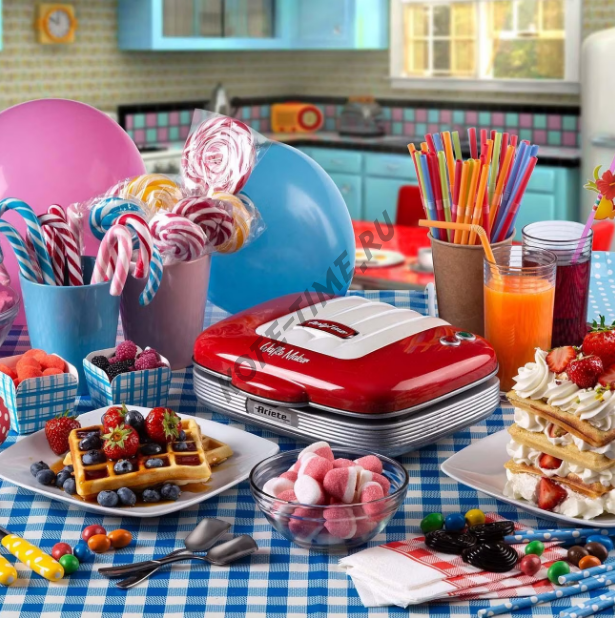 Прибор для приготовления вафель Ariete 1973 из серии Party Time в ретро-дизайне позволяет печь одновременно пару пышных вафель квадратной